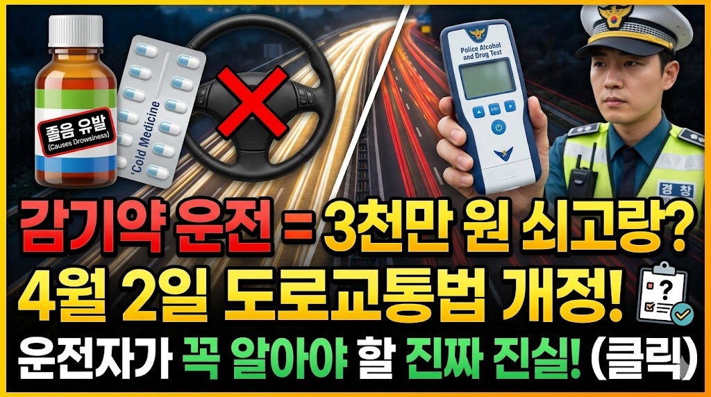 서론: SNS를 뜨겁게 달군 '감기약 운전 쇠고랑' 괴담의 실체"오는 4월 2일부터는 감기약 한 알만 먹고 운전해도 바로 수갑 찬다던데, 사실인가요?"최근 운전자 커뮤니티와 단톡방을 중심으로 공포에 가까운 루머가 확산되고 있습니다. 도로교통법 개정안 시행이 코앞으로 다가오면서, 단순한 감기약 복용조차 범죄자로 몰릴 수 있다는 불안감이 커진 것이죠. 유튜브에서는 '약 성분이 체내에 2주간 남아서 무조건 걸린다'는 식의 자극적인 영상들이 조회수를 쓸어 담고 있습니다 . 법 시행을 단 며칠 앞둔 지금, 20년 경력의 전문가 시선으로 이 혼란의 실체와 여러분이 진짜로 조심해야 할 **'법적 사각지대'**를 명확하게 짚어드리겠습니다. 이 글을 끝까지 읽지 않으시면, 본의 아니게 음주운전보다 무거운 처벌을 받게 될지도 모릅니다. |