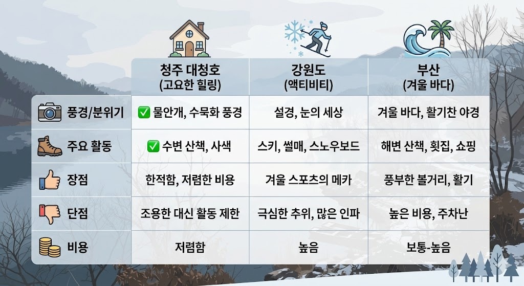 | 비교 항목 | 청주 대청호 | 강원도 평창 (스키장/양떼목장) | 부산 (겨울 바다) |