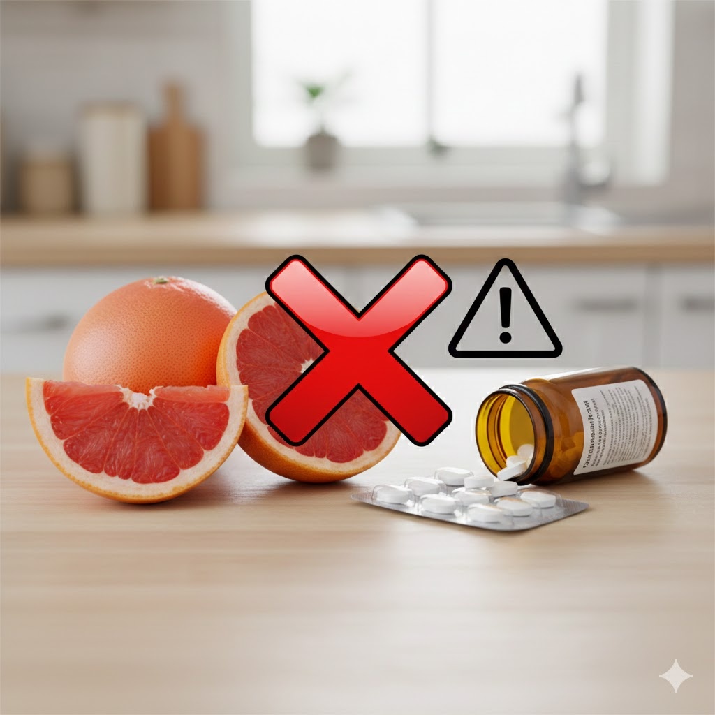 ✅ 핵심 요약 강조: 자몽 속 '푸라노쿠마린' 성분은 간의 약물 분해 효소를 억제하여, 혈중 약물 농도를 평소보다 3배 이상 폭증시켜 저혈압 쇼크를 유발할 수 있습니다.