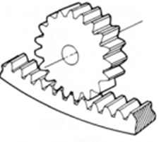 | 헬리컬 렉 | 헬리컬 기어와 맞물리는 비틀림을 가진 직선 치형의 기어입니다 . 헬리컬 기어의 피치원통 반지름이 무한대 ∞로 된 기어입니다. | ![]() |