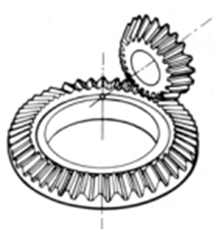 | 스파이럴 베벨기어 | 잇줄이 곡선이며 비틀림각 을 가진 베벨기어입니다 . 직선 베벨기어보다 제작이 어렵지만 강하고 조용한 기어로서 폭 넓게 사용되고 있습니다 | ![]() |
