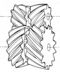 | 헐리컬기어 | 잇줄이 나선인 원통기어입니다 . 평기어보다 강하고 조용한 기어로서 폭 넓게 사용되고 있습니다 . 축방향력 ( 스러스트 ) 이 발생합니다 . | ![]() |