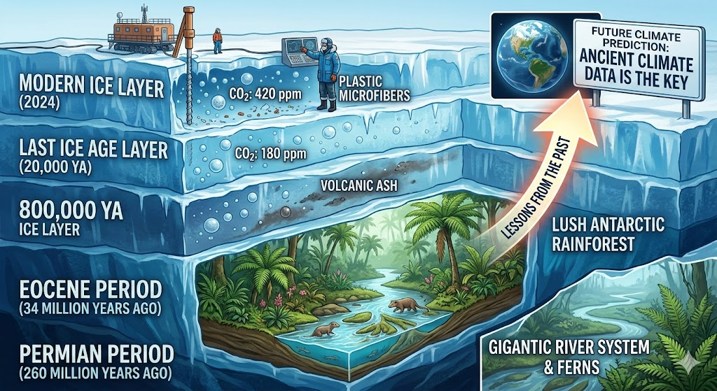 ✅ 핵심 요약 강조: 남극 빙하 속 공기 방울은 수십만 년 전의 대기 성분을 그대로 보존하고 있어, 과거 빙하기와 온난화의 주기를 정확히 증명합니다.