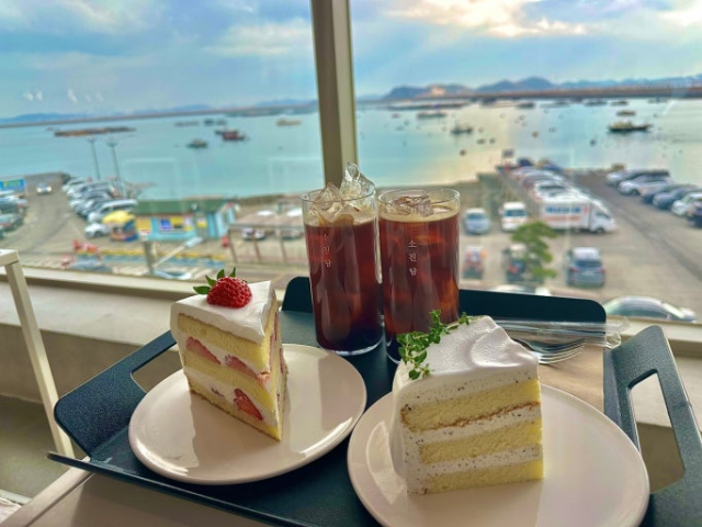 - 통창 너머로 펼쳐지는 바다 풍경과 프리미엄 수제 케이크