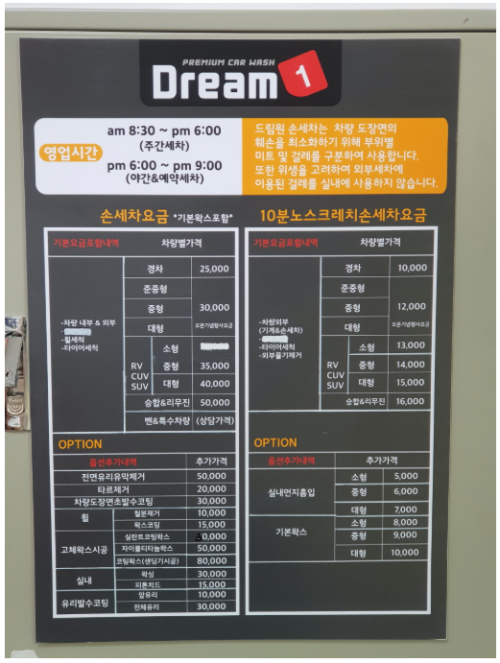 프리미엄 세차 서비스인 "Dream 1"의 가격을 확인할 수 있습니다. 기본 세차는 25,000원에서 50,000원까지 다양하며, 추가 서비스에 따라 가격이 달라집니다.