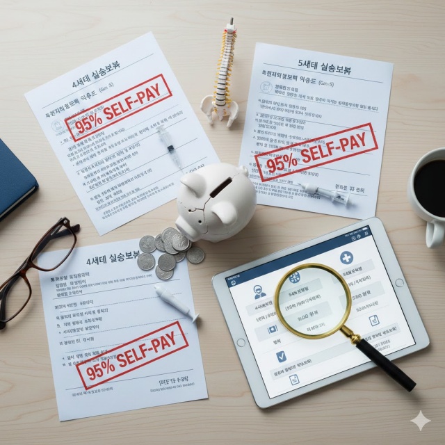 보험 설계사나 보험사의 권유로 5세대로 갈아타기 전, 지난 1~2년간 나의 비급여 이용 내역을 확인하세요. 만약 만성 통증으로 정기적인 도수치료나 비급여 주사 치료를 받고 있다면, 4세대 이하 기존 보험을 유지하는 것이 경제적으로 훨씬 유리할 수 있습니다. 5세대는 '병원을 거의 안 가는 건강한 사람'에게 특화된 구조입니다.