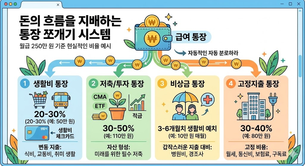 서론: 왜 내 통장은 늘 '텅장'일까?매달 꼬박꼬박 월급이 들어오는데, 카드값과 공과금이 빠져나가고 나면 남는 게 없는 기분. 아마 많은 분이 공감하실 겁니다. 적금을 부으려 해도 갑작스러운 경조사나 병원비 때문에 결국 중도 해지하는 악순환을 반복하곤 하죠.문제는 여러분의 의지력이 아니라 **'시스템'**에 있습니다. 돈의 흐름이 한눈에 보이지 않으면 소비를 통제하기란 불가능에 가깝습니다. 오늘 소개해 드릴 **'통장 쪼개기'**는 단순히 계좌를 여러 개 만드는 행위가 아닙니다. 돈에 '이름'을 붙여 목적 없이 새어나가는 지출을 막는 강력한 자동화 시스템입니다. 이 글을 끝까지 읽으시면, 여러분의 자산이 어떻게 스스로 불어나는지 그 로직을 완벽히 이해하게 될 것입니다. |