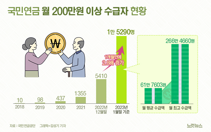 국민연금 수령액은 가입자의 평균 임금, 가입 기간, 그리고 납입 보험료에 따라 달라집니다. 최근 통계에 따르면 국민연금 수령액이 200만원을 넘는 수급자도 증가하고 있습니다. 특히, 2023년 기준으로 2백만 원 이상을 수령하는 수급자는 5,290명에 달하며, 이는 2018년의 10명에 비해 엄청난 증가세입니다.