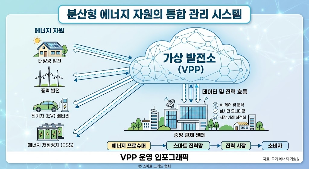 ✅ 핵심 요약 강조: 전국에 흩어진 태양광, ESS, 전기차 배터리 등을 ICT 기술로 묶어 하나의 물리적 발전소처럼 기능하게 만드는 것이 VPP 운영의 핵심입니다.