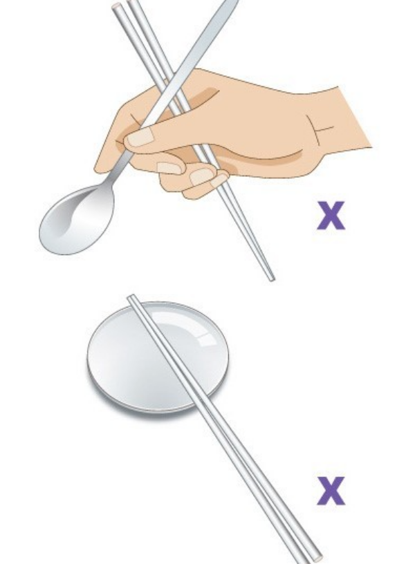 2) 수저 사용법: 밥과 국은 숟가락으로, 반찬은 젓가락으로 먹는 것이 일반적입니다. 식사 중에 숟가락과 젓가락을 동시에 들거나 한손으로 쥐는 것은 예의에 어긋난다고 여겼습니다. 또한, 밥그릇이나 국그릇을 손으 로 들고 먹지 않습니다.