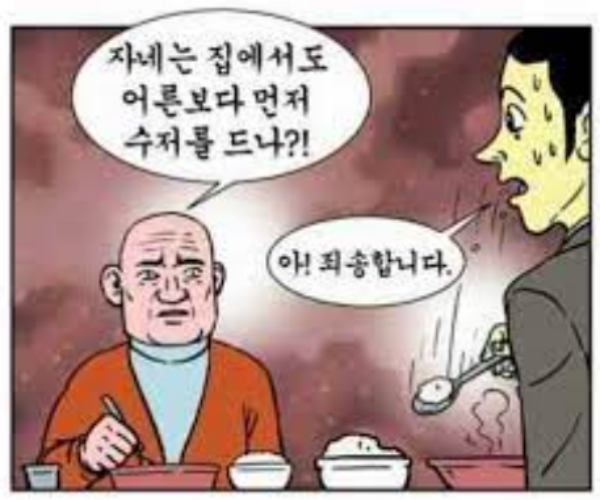 1) 어른 먼저 수저 들기: 밥상에서는 나이가 가장 많으신 분이 먼저 수저를 드신 후에 다른 사람들이 식사를 시작하 는 것이 예의입니다. 이는 웃어른을 공경하는 한국의 유교적 가치관이 반영된 것입니다.
