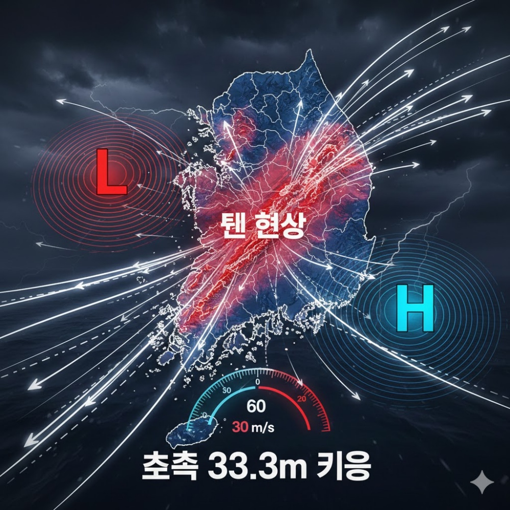 공기는 기압이 높은 곳에서 낮은 곳으로 흐릅니다. 마치 경사가 가파른 언덕에서 공이 빨리 굴러가듯, 기압 차가 커질수록 바람의 속도는 기하급수적으로 빨라집니다. 현재 한반도는 따뜻한 남풍과 차가운 북서풍이 격렬하게 충돌하는 지점이 되어 거대한 바람 통로가 형성되었습니다.