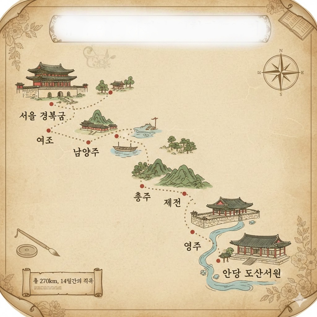 퇴계 이황의 마지막 귀향길은 서울 경복궁 사정전에서 출발하여 남양주, 여주, 충주, 제천, 영주를 거쳐 안동 도산서원에 이르는 약 270km(700리) 구간입니다. 하루 평균 20km 내외를 걷는 이 여정은 단순한 행군이 아닌, 선생이 머물렀던 정자와 강나루터에서 그가 남긴 시와 철학을 만나는 시간입니다.