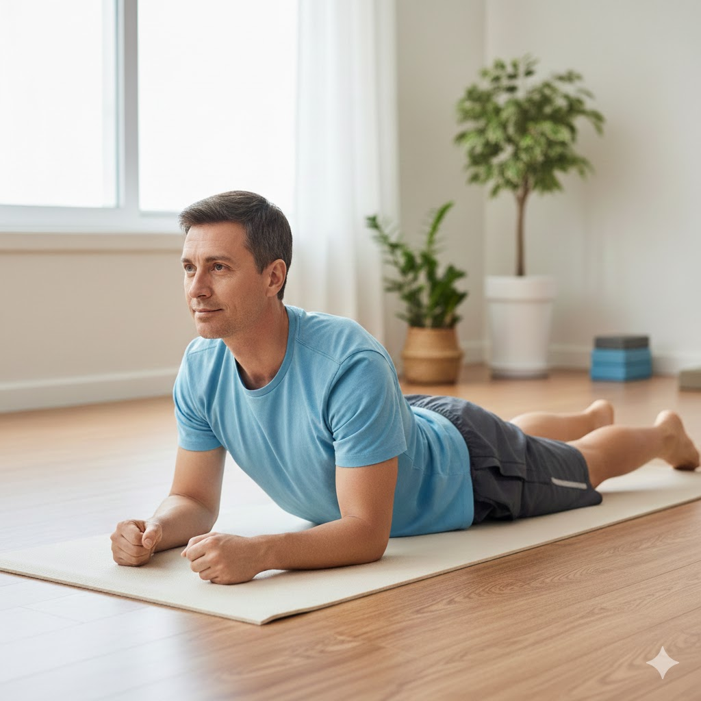 • 자세: 엎드린 자세에서 팔꿈치를 어깨 바로 밑에 대고, 양팔을 바닥에 붙여 상체를 들어 올립니다. 마치 스핑크스처럼 보이는 자세입니다.