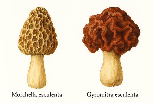 - 오른쪽: 마귀곰보버섯(Gyromitra esculenta) — 뇌처럼 울퉁불퉁한 갓, 짧고 굵은 자루.